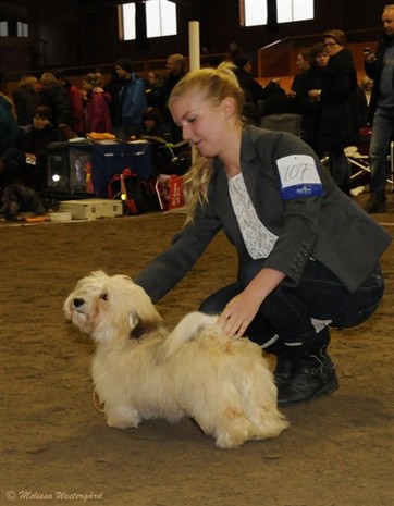Mycket lovande hanvalp. Utmärkt helhet. Utmärkt huvud. Vackra ögon. Väl ansatta öron. Utmärkt front och skuldra. Normala vinklar bak. Härlig utväxt päls för åldern. Rör sig och visar sig utmärkt. 1 HP 1, BIM